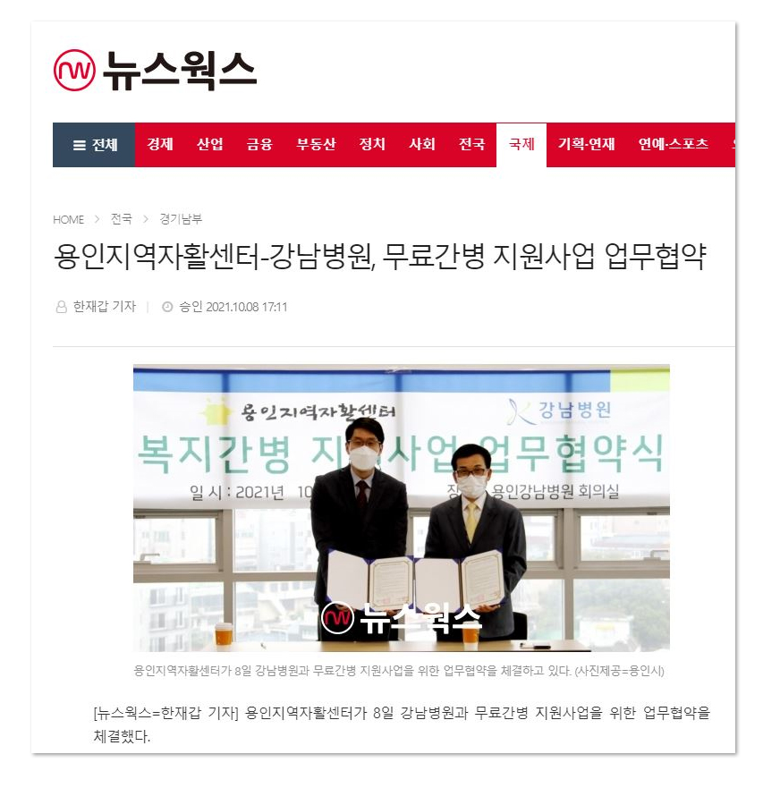 제목 [언론보도]용인지역자활센터-강남병원, 무료간병 지원사업 업무협약